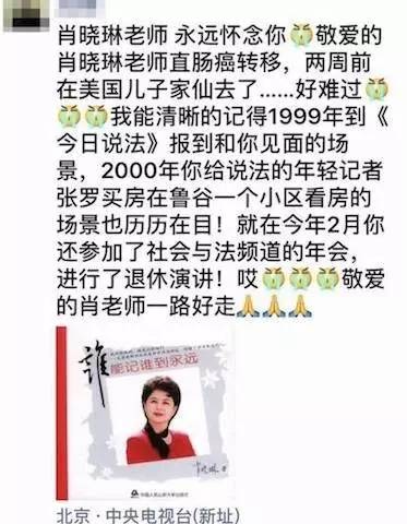 7月12日,有媒体报道称,从央视《今日说法》栏目多名员工处获悉,央视著名节目主持人、制片人肖晓琳因患直肠癌,近日在美国治病期间不幸离世。
