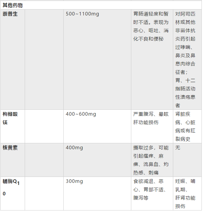 除上表中的药物,美国指南还推荐使用小白菊(50-300 mg bid)、蜂斗菜(50-75 mg bid)等植物提取物。