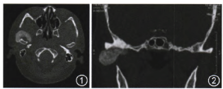 CT:右颞下颌关节有一不规则钙化高密度灶,呈哑铃形。外侧部分类似球形,突破关节腔位于颧弓下方、乙状切迹外侧及髁突前方;中间部分沿关节腔分布,呈盘状,与关节面间有潜在间隙,患例关节腔较健侧明显增宽;内侧部分跨越关节结节向前内斜形进入颞骨鳞部和蝶骨岩部,颅底骨质破坏(图1~3)。