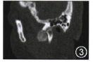 图1CT可见病灶突出关节腔内外侧呈球状生长;图2颞下颌关节间隙不均一的高密度盘状钙化影,钙化影与髁突之间可见潜在间隙,病灶沿关节间隙分布,并向间隙内及外突出;图3病灶向前内突出至颞下窝.钙化物超越关节腔向外突出至面部,向内扩展至颅底;