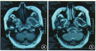 MRI:右颞下领关节及颅底可见形态不规则结节状,T1稍长、T2不均匀信号影,间隙增宽,病变边缘光滑,与周围组织界限清晰,右侧翼内、外肌萎缩。增强扫描病变内可见不均质中等程度强化。提示:右颞下颌关节良性肿瘤(图4~6)。