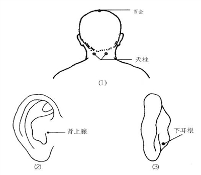 有效穴位 百会、天柱、肾上腺、下耳根等耳穴(图1)。