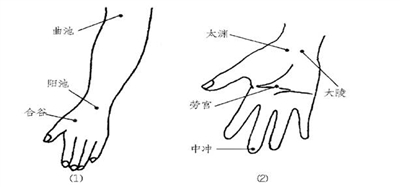 有效穴位 曲池、阳池、合谷、太渊、劳宫、中冲等穴(图2)。