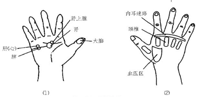 手部有效反射区 大脑、肾上腺、肾、肝、脾、血压区、内耳迷路、颈椎等反射区(图3)。