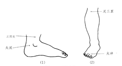 有效穴位 三阴交、太溪、太冲、足三里、涌泉等穴位(图4、图5)。